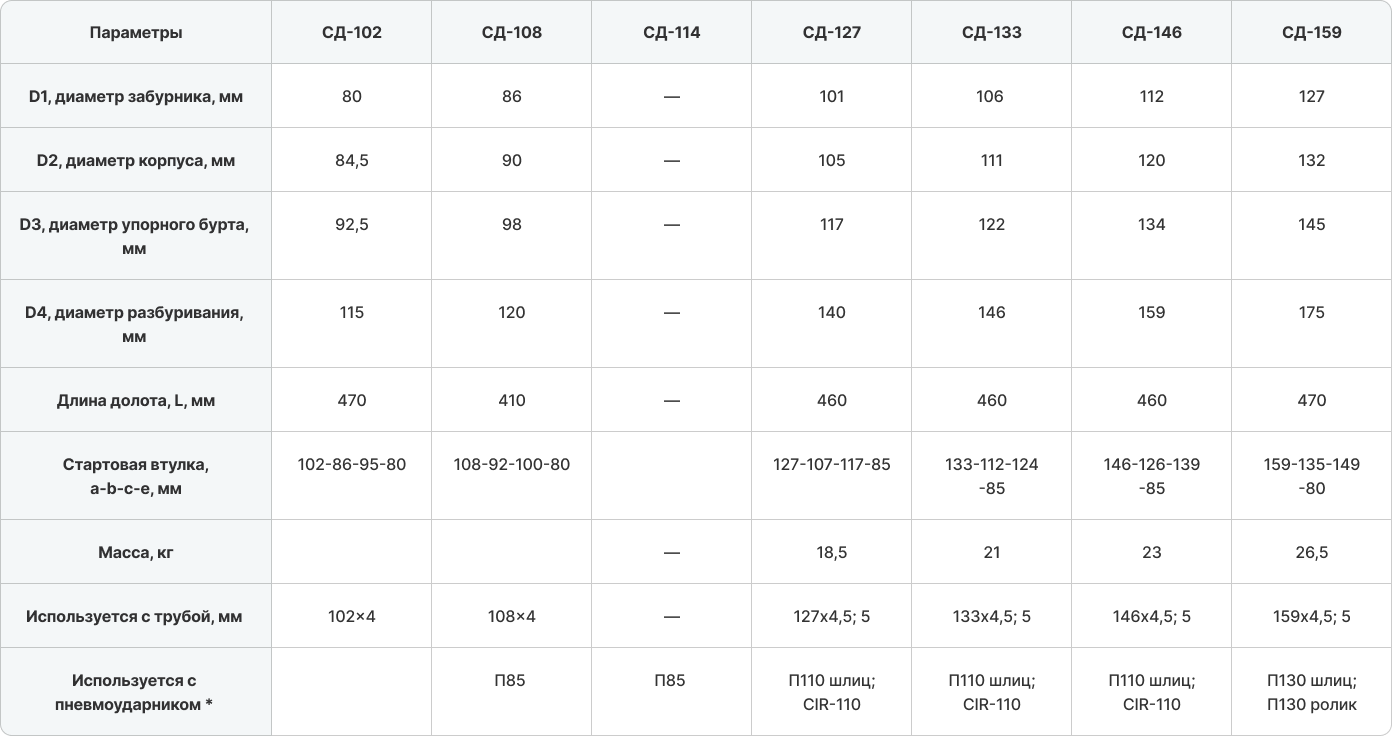 * Долота могут быть изготовлены под любой хвостовик в том числе Atlas Copco и CIR.